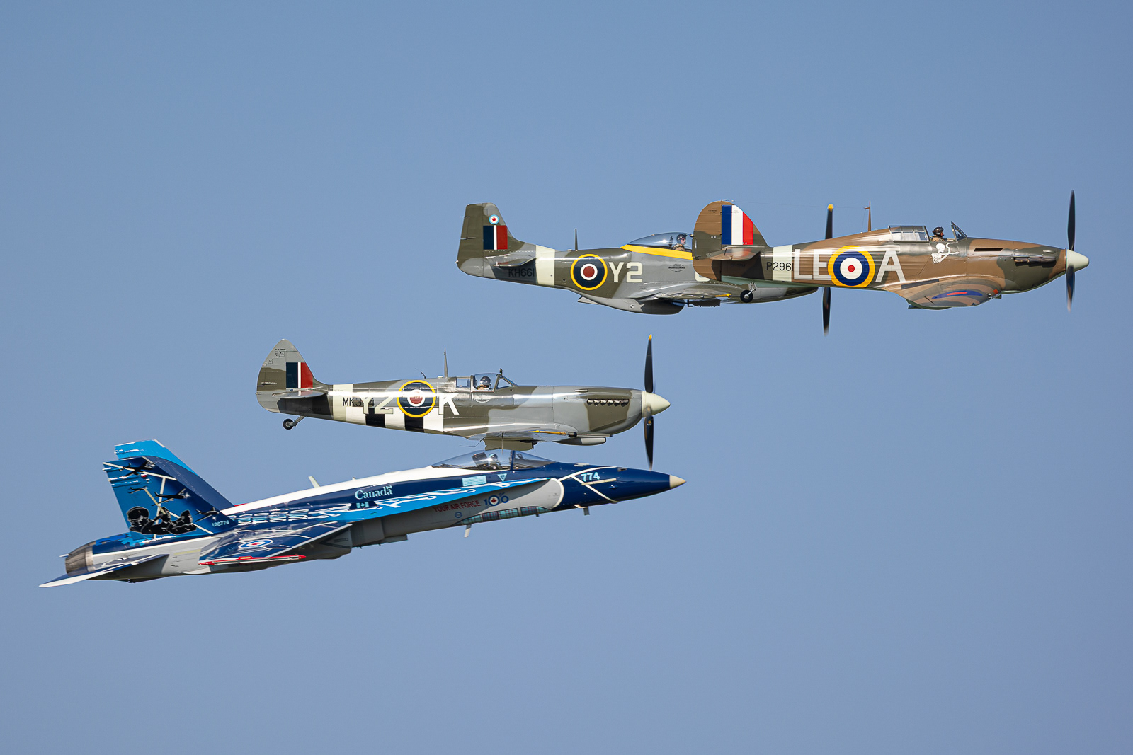 2024 marquant les 100 ans de cette prestigieuse force aérienne, il fut bien à propos de mettre à l’honneur l’aviation de ce voisin américain. Pour l’occasion le Vintage Wings of Canada dépêcha à Oshkosh quelques uns de ses plus beaux joyaux. Comme le très beau Spitfire Mk IX, le Mustang dans une superbe livrée très rarement vu où bien encore le sublime Hawker Hurricane Mk XII. Le Canadian Warplane Heritage ne fut pas en reste en envoyant son imposant Lancaster qui malheureusement ne vola qu’un seul jour, et dont il ne fallut surtout pas manquer le spectaculaire décollage en fin de journée !
